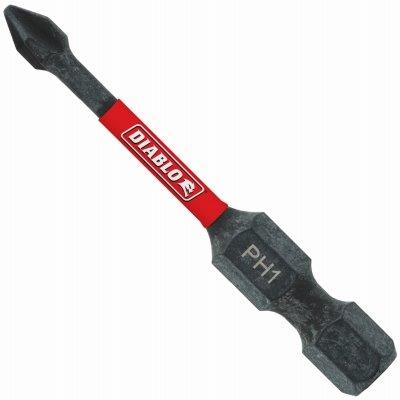 Diablo, 5 pack 2″ #1 phillips drive bits. Diablo’s driver bit range of phillips bits delivers maximum performance, extreme durability and up to 50 times longer life when installing and removing fasteners. An optimized tip design provides a strong, precise grip that reduces wear, stripping and slippage. Torque resistant design absorbs torque for less stress at the tip when tightening and removing nuts and screws. This range is impact strong, delivering increased shank stability and durability in cordless and corded impact and drill drivers.