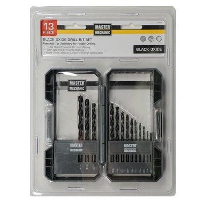 Master Mechanic 13 Piece, Set contains 1/16″, 5/64″, 3/32″, 7/64″, 1/8″, 9/64″, 5/32″, 11/64″, 3/16″, 13/64″, 7/32″, 15/64″, 1/4″, 135 split point, jobber Length, steel shank. Features 135 point angle with 4 cutting edges which eliminate walking and provides fast penetration. Black oxide tempering treatment reduces frictional resistance and improves chip flow. Recommended for drilling wood, plastic, wallboard, plywood and soft metals, aluminum, brass and bronze. For occasional use in stainless steel and other hard metals.