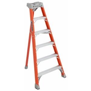 6-Ft., Fiberglass, Type IA Tripod Step Ladder, 300-Lb. Duty Rating, Molded Plastic Tool Top With Tool Slots, Slip Resistant Feet, Full Metal Boot, Reinforced Bottom Brace, Meets OSHA & ANSI Standards, Non-Conductive Fiberglass, Center-Pull Spreader Brace, Steel Reinforced Outrigger, Double-Rivet Step Construction, -Inch3 Legged Design Allows For Special Uses: In Corners, between studs, tight spaces-Inch,