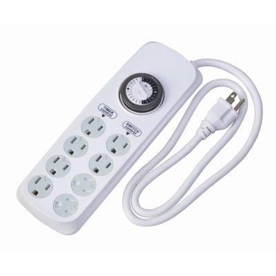 Woods 22575 8-Outlet Power strip with 24-Hour Timer This indoor power strip has 8-Outlets, 4 are timer controlled, and 4 are On/Off-switch controlled. You can come home to a lighted house every day of the week. the timer settings repeat daily, so you can have lights and appliances turn on at the same time every day. It has 48 on/off settings for the timer which gives you have half-hour increments. Unlike old fashion timers, this one has pins that cannot be lost. it has a 4 foot 14/3 grounded power cord, and the circuit breaker shuts off power if overloaded. it also has child prevention sliding outlet covers on each outlet.