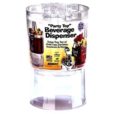 1.75 gallon beverage dispenser, party top tray lid holds garnishes & cups, ice cone, keeps drinks cool, but not diluted, indoor & outdoor use, made from break resistant tritan material, top rack dishwasher safe for easy clean up, stackable reservoirs & chalkboard id make serving multiple drink types easy, bpa free.