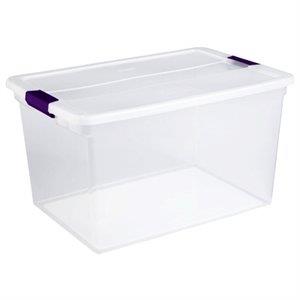 66 qt, clear view latch box with plum latches, ergonomic latches that attach the lid securely to the base yet are still easy to unlatch, allow contents to be easily identified from any angle & multiple bases are able to stack on top of each other, ideal for storing shoes & other small items around the home & fits conveniently on 16″ wire closet shelving, dimensions: 23.625″l x 16.375″w x 13.25″h.