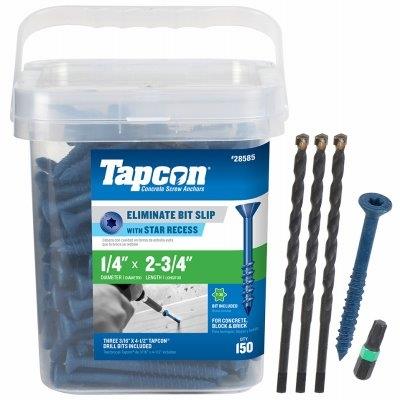 150 Pack, 1/4″ x 2-3/4″,Star Drive Concrete Anchors, Tapcon Bit Included, Secure Attachment To Concrete, Block & Brick, 1 Piece Design Requires No Assembly, Does Not Require Anchor Torque Down, Cracked & Seismic Approved, Blue Climaseal Adds Corrosion Resistance, ANSI Drill Bit Required.