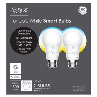 Ge Cync, 2 pack, CLEDA199SD1-2P, 11w, soft white, daylight color, a19, frost color, c sleep smart bulb, equivalent to a 60w incandescent, medium base, dimmable, 800 lumens, 2,700 & 5,000 kelvin color temperature, cri=80, 13.7 year, 15,000 hours rated life, mol=4.3″, for the bedroom, supports circadian rhythm, 3 color settings, sleep, wake & every day, voice control, simple set up, out of home control, made for google & compatible with alexa.