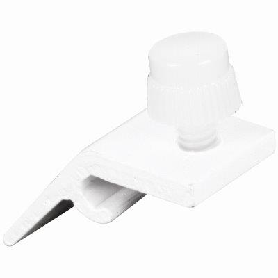These storm door panel clips are constructed from aluminum and come in a white finish. Typically they help to secure your glass and screen panels to your storm door frame. Dimensions are a 1 in. length, with a 1/2 in. width and a 7/16 in. offset. The self-locking design features adjustable tension and fits standard taps. Each 8 pack comes with knurled head screws that do not require tools to install.