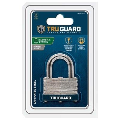 Tru-guard, 1-3/4″ wide, warded steel padlock with 1″ long hardened steel shackle for resistance to cutting & sawing, shackle dimensions 1/4″ shackle diameter, 1″ height, 7/8″ width.