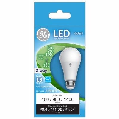 GE LED13A30/100/5KB, 3 Way, 4W/9W/13W, Daylight Light Color, White Bulb Color, A19 Shape, LED Light Bulb, Equivalent To A 30W/70W/100W Incandescent, Medium Base, Non-Dimmable, 400/980/1,400 Lumens, 5,000 Kelvin Color Temperature, CRI = 80, 13 Year, 15,000 Hours Rated Life, MOL = 5.31″, Boxed.