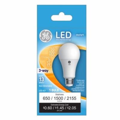 GE, LED50/150DL1, 3 Way, 5W/12W/17W, Daylight Light Color, White Bulb Color, A19 Shape, LED Light Bulb, Equivalent To A 50W/100W/150W Incandescent, Medium Base, Non-Dimmable, 650/1,500/2,155 Lumens, 5,000 Kelvin Color Temperature, CRI = 80, 13 Year, 15,000 Hours Rated Life, MOL = 5.31″, Boxed.