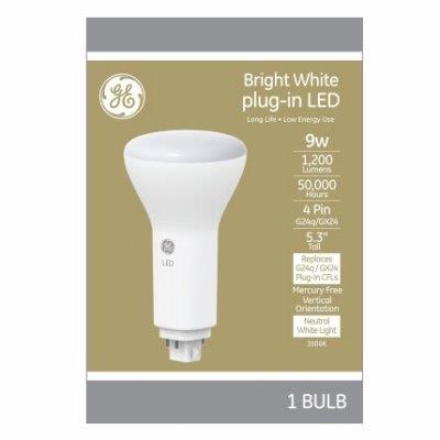 GE LED9G24Q-V/835L . This is a 9 watt CFL retrofit plastic bulb with a G24q/GX24 base that is equivalent to a 18 watt CFL. The color temperature is 3500K with Lumens: 1200. It has a CRI: 80 and an MOL: 5.3″. It is Non-Dimmable with a 50000 hour rated life. It is a Vertical mount.