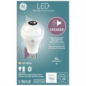 GE 93100352, led+9da21a/spk-1, 9w, soft white light color, frost bulb color, a21 shape, led+, speaker led bulb, equivalent to a 60w incandescent, medium base, dimmable, 760 lumens, 3,000 kelvin color temperature, cri=80, 22.8 year, 25,000 hours rated life, mol=4.47″.
