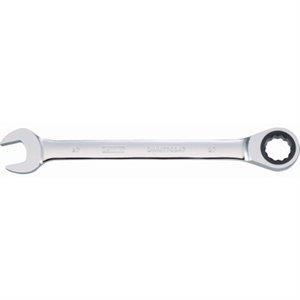 27 mm, ratcheting combination wrench, long panel design for more leverage, stamped pattern on wrench handle for grip, full polish chrome, stamped twice on both sides of wrench handle for easy size identification, direct torque technology helps prevent rounding of fasteners, full lifetime warranty.
