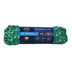 3/8″ x 50′, polypropylene rope, 130 lb safety work load, diamond braided, light weight & floats, assorted colors, green, red, yellow & blue, red & white, hank.
