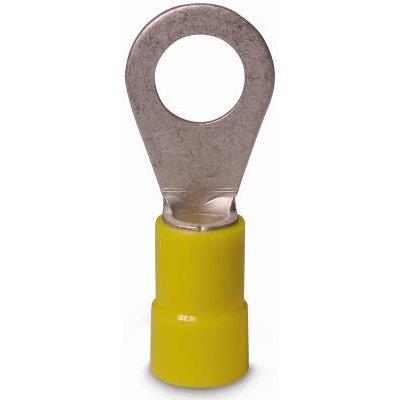 14 Pack, Ring Terminal, Vinyl Insulated Barrel, Solderless, 12-1/4 Stud, 12-10 AWG, Rated At 600V Maximum, Temperature Rating 167 Degrees Fahrenheit, 75 Degrees Celsius, UL Approved.