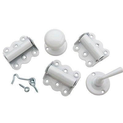 v1771 screen door kit in white, designed for full surface applications, includes: 3 – spring hinges, 1 – door pull, 1 – door knob, 1 – hook and eye latch, mounting screws .