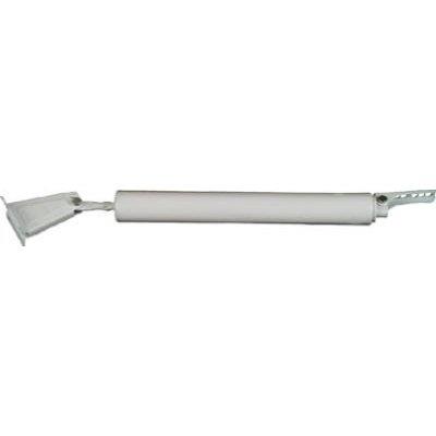 White posi-glide door closer, designed for wood or metal screen & storm doors & other lightweight doors, adjustable closing speed, positive latching assures that the door completely shuts in the latch, door will swing open approximately 90 degrees, patented posi-glide shock-absorbing system for resisting wind damage.