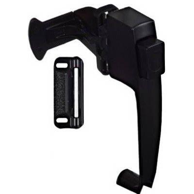 Satin black push button door latch, for wood or metal screen & storm doors with 1-1/4″ hole spacing, will fit doors up to 2″ thick, use pan machine screws 8-32 x 2-3/8″ not provided, 1 piece shaft provides firm pushbutton action, offers anti lockout design, inside latch has exclusive double lock deadbolt security.