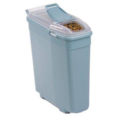 Small, smart storage pet food system, holds 10 lb. lid snaps into place for easy pouring, easy access handle on bottom, no scoop required, air tight seal to keep food fresh & insects out, convenient design for stackable use.