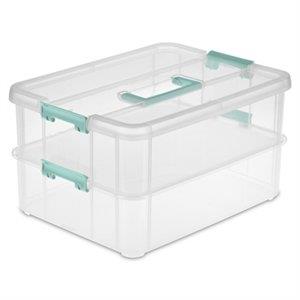 Stack & Carry 2 Layer Handle Box – clear lid and layers, with Aqua Chrome handle and latches. 14.375″L x 10.75″W x 7.625″H. The Stack & Carry 2 Layer Handle Box is perfect for sorting and containing small items, while providing on the go storage solutions. The top layer of the box features a sturdy grip handle for easy carrying, while recessed lids offer exceptional stacking capabilities. Color accent latches securely lock layers into place and allow individual layers to be removed easily for quick access to items enclosed. Each layer accommodates 8 ½” x 11″ paper, making it ideal as a school, office or countertop organizer.