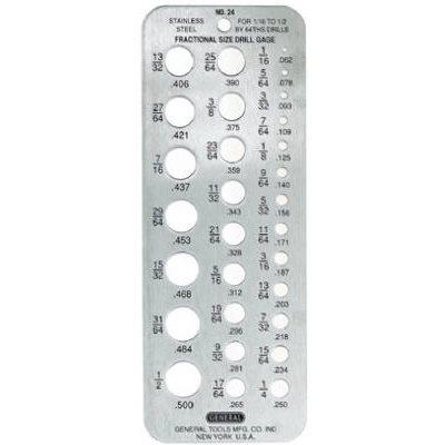 Fraction Drill Gauge, Stainless Steel Gage Conveniently Identifies Drill Bit Sizes From 1/16″ To 1/2″ x 64 THS, Etched Graduations Are Filled In Black To Give High Contrast & Will Not Wear Off, Gage Measures 2-3/8″ x 6-3/4″ Overall, Stainless Steel Will Not Rust.