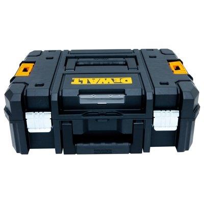 Dewalt, case with flat top, flexible platform allows different combinations, all units can stack on top of the other, connected with durable slide latches, removable covered cups & removable dividers, ball bearing slides, heavy duty metal latches & hinges.
