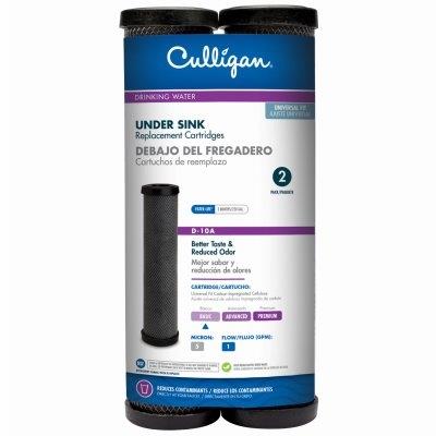 The Culligan® D-10 2-pack Level 1 Basic Filtration cartridge reduces bad taste & odor, aesthetic chlorine taste & odor and sediment. The replacement cartridge fits model US-600A. The cartridge is for point-of-use under-sink applications. The filter is not recommended for use with non-treated well water supplies and is not for point-of-entry whole house applications. The cartridge life is up to 3 months or 250 gallons. Cartridge change reminder sticker included.