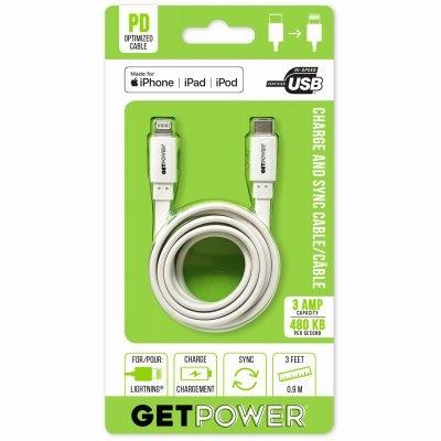 3′ USB-C to Apple Lightning charge/sync cable. PD optimized cable supports quick charge technology. 3 Amp capacity. 480 KB per second sync times. MFi certified. USB-C certified.