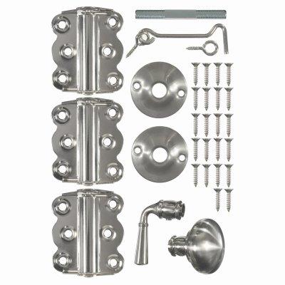 • Kit contains: (3) spring load hinges, (1) knobs, (1) lever, rosettes and hook & eye