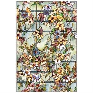 24″ x 36″, trellis, window film, an inexpensive alternative to stained glass, translucent but not transparent, allows light to enter the room, provides privacy, no adhesive necessary, will tile together like wallpaper, top to bottom, left to right, can be easily removed with no adhesive residue after years of installation, easily trimmed to fit, self static adhering, no adhesives.