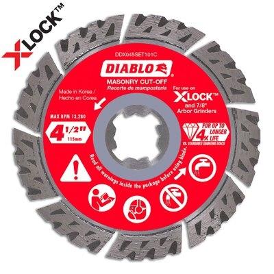 Diablo, 4-1/2″, x-lock, diamond segmented, turbo, masonry, cut off disc, diamond continuous rim masonry cut off discs provide extreme durability, minimal downtime & increased productivity, 4x longer cutting life versus a standard diamond cut off disc, industrial grade diamonds with hardened disc body delivers lasting durability & maximizes cutting quality in hardened materials even in extreme applications, designed to be backwards compatible, these discs work with x-lock angle grinders & 7/8″ arbor angle grinders.